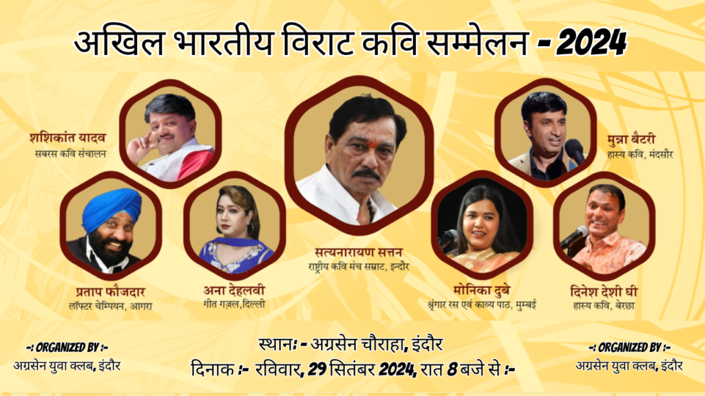 On Sunday, 29th September, at 8:00 PM, a grand Kavi Sammelan (Poetry Symposium) will be held at Agrasen Chauraha, Indore, organized by the prestigious Agrasen Youth Club as part of the Agrasen Jayanti Mahotsav. This annual celebration will feature renowned poets from across the country, sharing their poetic compositions.