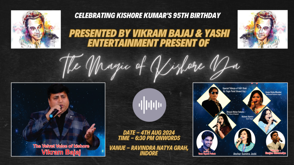 Join us for a grand celebration of the legendary Kishore Kumar’s 95th birthday, organized by Vikram Bajaj and Yashi Entertainment. This musical extravaganza will take place on August 4th, 2024, at 6:30 PM at Ravindra Natya Grah, RNT Marg, Indore.